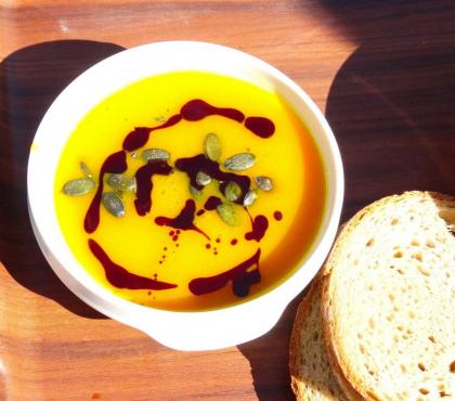 Juho ponudite z žličko kisle smetane, potresite z bučnimi pečkami in pokapajte z bučnim oljem, ki ga z zobotrebcem razvlečete v vzorček.