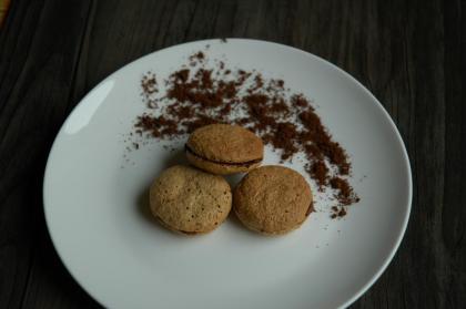 Preostalih 50 g beljakov stepite v rahel sneg, dodajte v tankem curku kavni sirup in stepajte da dobite čvrsto in sijočo zmes. Kavne beljake dodajte mandljevi pasti in rahlo zmešajte v enakomerno zmes. Z zmesjo napolnite vrečko za brizganje z večjim okroglim nastavkom. Vrečko držite navpično in na pekač nabrizgajte kroge premera približno 4 cm. Nabrizgane pekače 2-3 krat udarite ob mizo, da se makroni sploščijo. Makrone pustite stati na zraku približno 30 minut (ali več), da se na vrhu malce posušijo. Nato jih pecite v pečici ogreti na 170 stopinj približno 15 minut. Vrata pečice naj bodo med peko malce odprta.