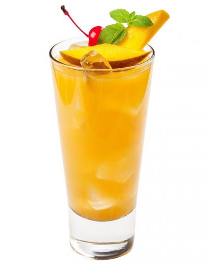 Postrezite v kozarcu za long drink, okrasite s koščki manga, listi mete in kandirano višnjo oz. češnjo.