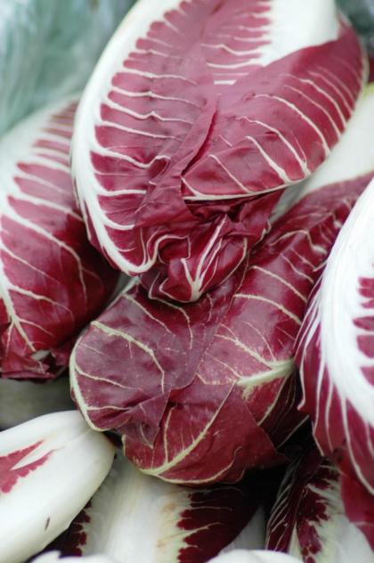 Radič razdelite na lističe, očistite, operite in narežite na trakove. V večji ponvi segrejte olje in na njem zdušite radič (približno 5 minut). Prilijte vino in med mešanjem kuhajte dokler vino ne izpari. Mešanico nato odstavite, ohladite, odcedite oziroma ožmite ter zelo drobno sesekljajte.