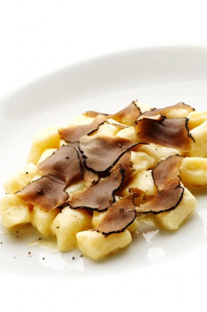 Njoke skuhajte po navodilu na embalaži v vreli slani vodi. Še vroče zmešajte s smetano in nanje naribajte črne tartufe.