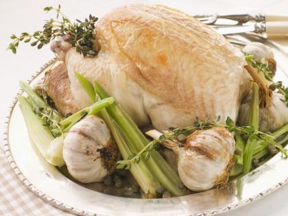 Izberite posodo za peko, ki jo lahko tesno zaprete. Na dno posode položite vse začimbe in nekaj strokov česna. Na tako pripravljeno posteljico položite piščanca, okoli njega pa razporedite preostal česen.