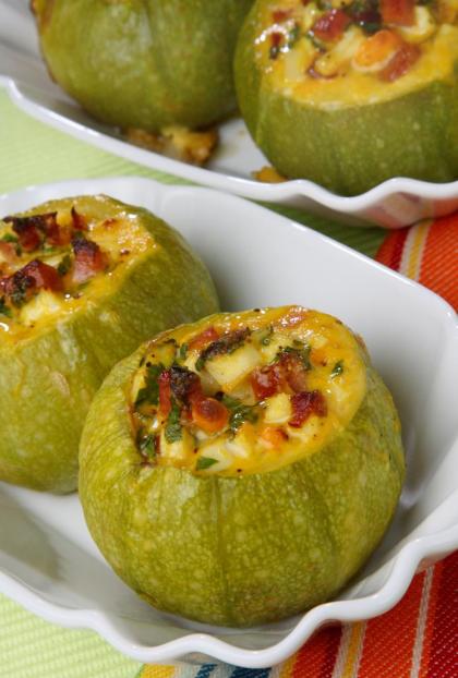 Zmes ohladite, z njo napolnite bučke, jih zložite v pekač in postavite v pečico, ki ste jo predhodno ogreli na 180 (ventilatorsko na 160) stopinj ter pecite 30 minut. Pečene potresite s preostalim peteršiljem.