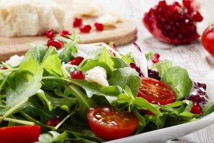 Rukolo operite in osušite. Češnjeve paradižnike razpolovite, posušene poberite iz olja in narežite na tanke rezance. Parmezan naoblajte. Vse sestavine rahlo zmešajte, solato začinite z oljčnim oljem, balzamičnim kisom in solnim cvetom.