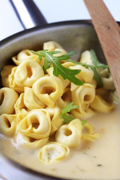 Zmešajte rumenjake in smetano ter mešanici dodajte malce vroče bešamelne omake. Nato vse skupaj umešajte v preostalo omako. Umešajte še sir in pri nizki temperaturi mešajte, da se sir stopi. Omaka ne sme več zavreti.