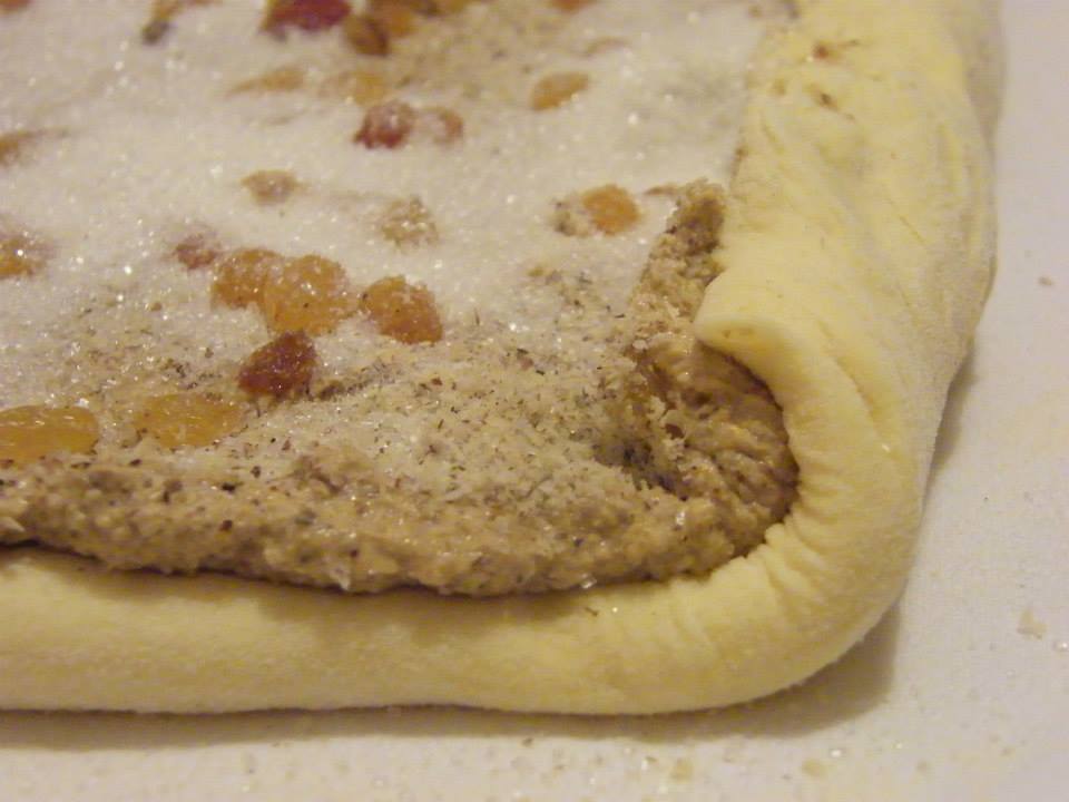 Sama pustim, da testo vzhaja samo enkrat. Potem ga iz sklede prevrnem na pomokano čisto rjuho ali delovno površino. Nato ga kar z rokami potlačim in oblikujem v pravokotnik in samo, če je potrebno, ga z valjarjem na rahlo razvaljam oz. razvlečem. Potice ne smemo pretenko razvaljati. Če boste vzhajano testo pregnetli, bo izgubilo elastičnost in težje ga boste razvaljali.