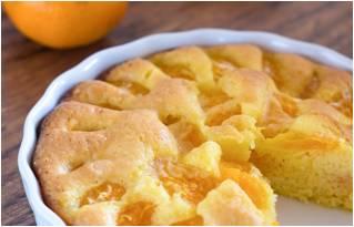 Pomaranče olupite tako, da jim odstranite tudi belo lupino. Nato jih narežite na približno 1 cm debele rezine. Moko zmešajte s pecilnim praškom. Namastite pekač. Pečico segrejte na 180 stopinj (ventilatorsko na 160). Gladko zmešajte 2 žlici pomarančne marmelade, pomarančni liker in sok.