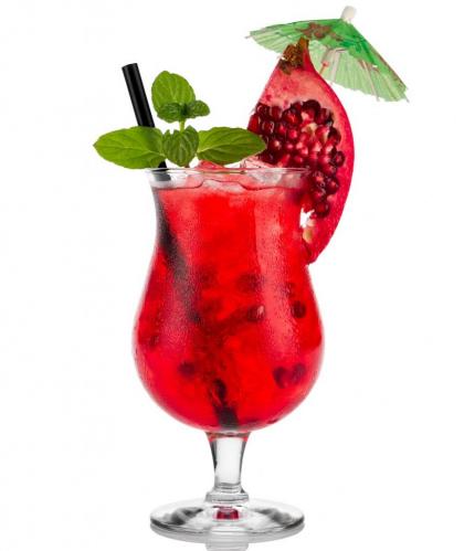 Zmešajte vse sokove v enakih deležih. Dodajte limonin sok in še enkrat premešajte. Okrogel kozarec napolnite z ledenimi kockami in vanj vljite mešanico sokov. Okrasite s semeni granatnega jabolka in svežo meto.