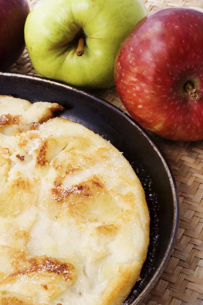 V ponvi segrejte malce masla, nanj vljite testo in ga obložite z rezinami jabolk. Ko je omleta na eni strani pečena, jo obrnite in specite še na drugi.