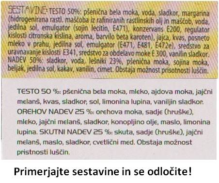 A predno se taka potica znajde v vašem nakupovalnem vozičku, preverite, kaj vse se v njej skriva. Zagotovo boste naši vsaj eno sestavino, ki je sploh ne poznate in cel kup takih, ki jih seveda v domačih poticah ni. Naj naštejem le nekatere: margarina (in to iz hidrogeniranih maščob z vsemi dodatki, ki pač sodijo v margarino), posneto mleko v prahu, emulgatorji (oz. več njih), sredstvo za uravnavanje kislosti, sredstvo za obdelavo moke, sojina moka (v lešnikovem oz. orehovem nadevu), vanilin, pripravek za pripravo kreme z okusom vanilje (sladkor, modificiran škrob, sirotka v prahu, glukozni sirup, mlečne beljakovine, gostilo, stabilizatorji (oz. več njih), barvilo), citrona, arome … Sestavine so prepisane iz več deklaracij potic različnih proizvajalcev in nadevov. Ne bomo se sedaj spuščali v podrobnosti dejanske škodljivosti posameznih sestavin, lahko samo zaključimo, da je sestavin enostavno preveč, da bi bil nakup take potice dobra odločitev. Zato potico enkrat za spremembo specite doma. Izberite enostaven recept z malo sestavinami. [2] Potica bo ravno tako okusna, vi pa boste izgubili strah pred njihovo peko.