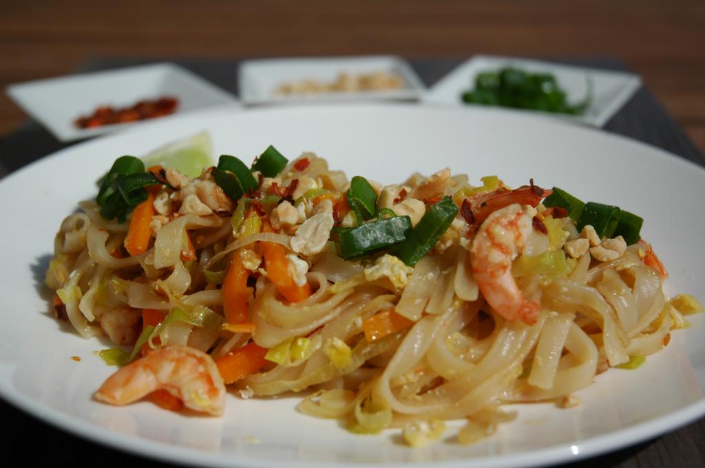 Zraven postrezite grobo sesekljane pražene arašide (neslane), narezano zelenje mlade čebule, kosmiče pekoče paprike (lahko tudi svežo) in limetine krhlje.