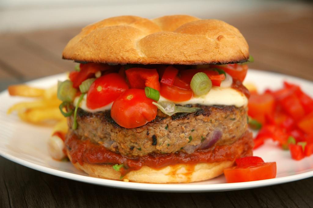 Pred peko burgerjev si pripravite vse dodatke. Solato operite in večje liste natrgajte, vse ostalo zrežite. Narežite tudi mocarelo in prerežite bombete.