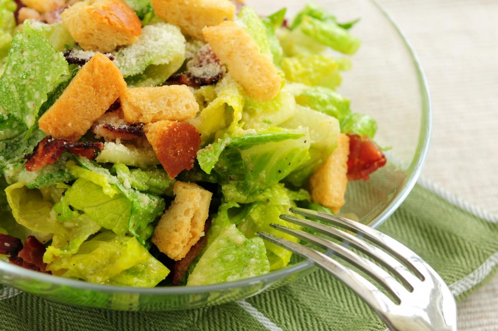 Solati odstranite zunanje liste, notranje pa narežite na grižljaj velike koščke. Denite jo v skledo (po možnosti leseno) in rahlo zmešajte s polovico preliva. Nato dodajte preostal preliv, hrustke in parmezan ter še enkrat rahlo zmešajte. Razdelite po ohlajenih krožnikih in ponudite.