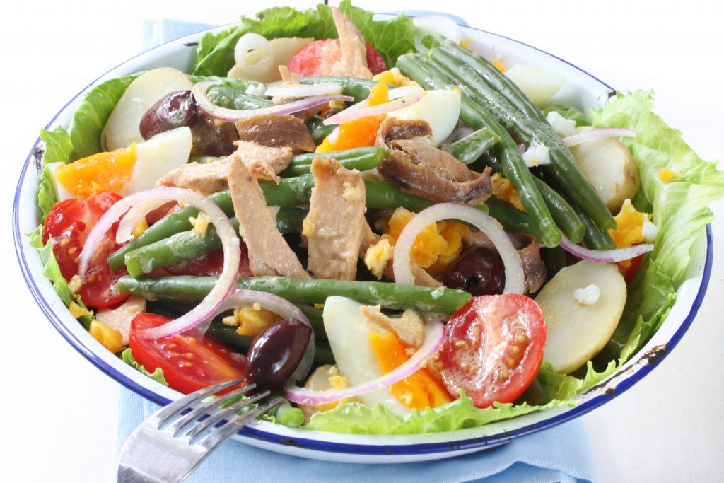 Solato razporedite po krožnikih in na vrh naložite tunino in rezine jajc.