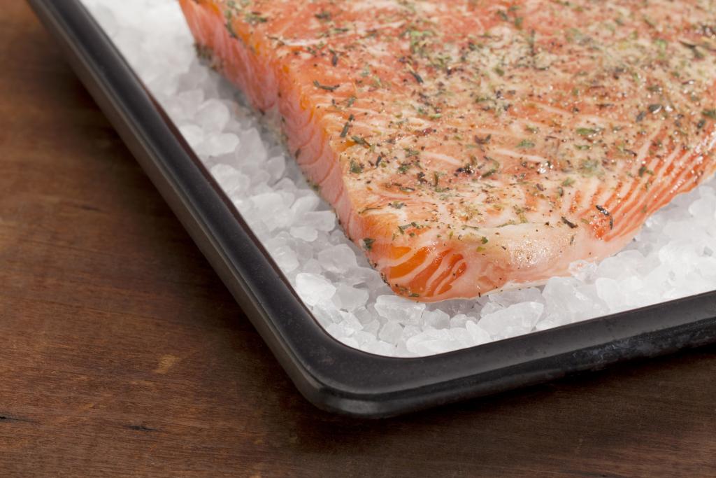 Pečenega lososa vzamemo iz pečice in previdno narežemo na kose. Pazimo, da ne predremo kože in da nam kosi na padejo na sol.