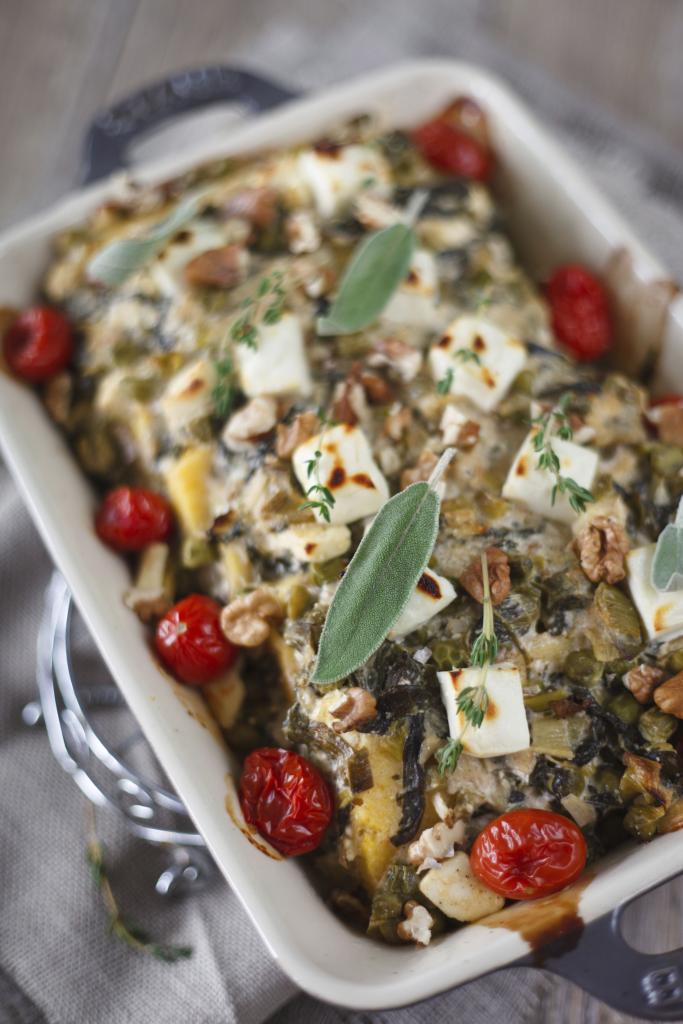 Polento z zelenjavo pecite v pečici približno 30 minut, da se preliv strdi. Pečeno jed potresite s svežim sesekljanim peteršiljem.