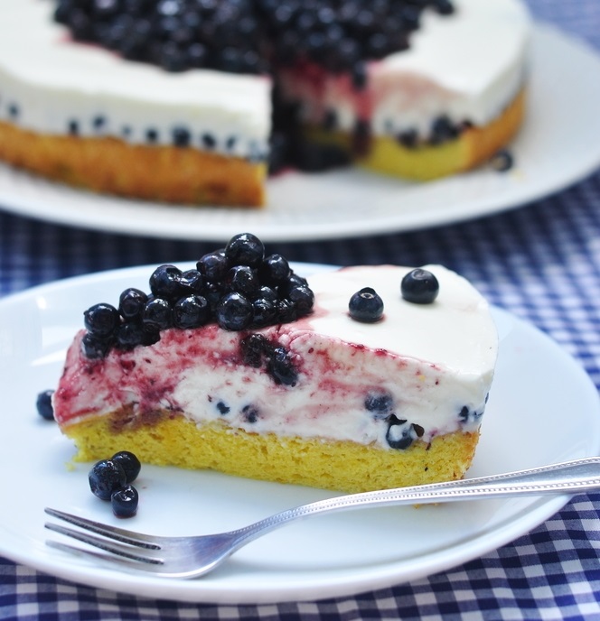 Liste želatine namočite v hladni vodi. Jogurt zmešajte s sladkorjem v prahu. Ožeto želatino pazljivo (ne sme zavreti) stopite na štedilniku ali v mikrovalovni pečici. Zmešajte jo s približno tremi žlicami jogurta, nato pa to vmešajte v preostal jogurt ter postavite v hladilnik. Po približno 30 minutah (ko se krema začne strjevati) umešajte čvrsto stepeno smetano in približno 300 g borovnic. Testo prestavite nazaj v pekač, na biskvit naložite pripravljeno kremo in za najmanj 4 ure postavite v hladilnik.