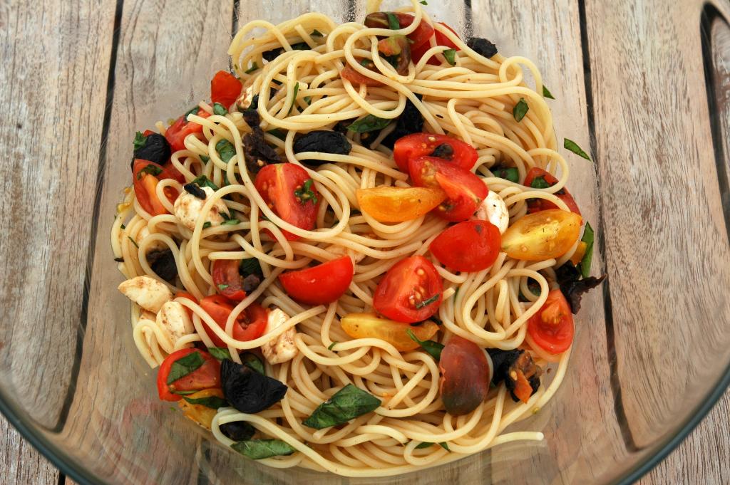 Špagete skuhajte al dente, jih odcedite, stresite v skledo z zelenjavo, malce jih še pokapajte z oljčnim oljem in nato zmešajte.